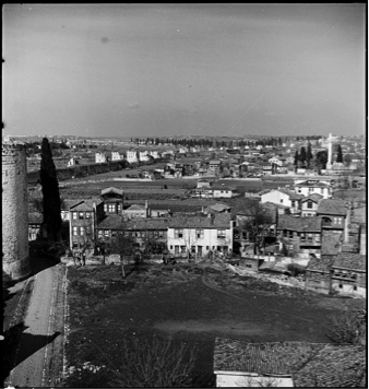 A year later in the summer of 1938, another photograph from the same collection illustrates the contrast between the still standing Byzantine walls and the vast neighborhood of two-storied houses with deciduous trees.