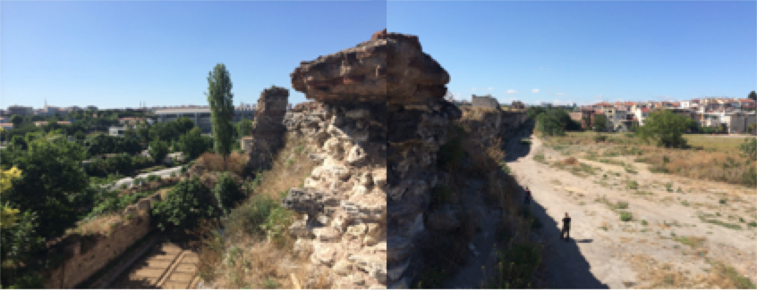 Much of the gardens within the walls have been replaced with the construction of concrete homes on gravel and cement. The same trees that once stretched across perpendicularly to the walls are now scant compared to the planted trees of residential homes. For the wall itself, there are now breaks and eroded segments, but its presence persists even against encroaching housing complexes. The changes in the vegetation are thus contrasted by the striking continuity of the Byzantine-Ottoman ramparts. While once farmed-on land is now lived-on land, the same wall still sweeps over the area of Yedikule.